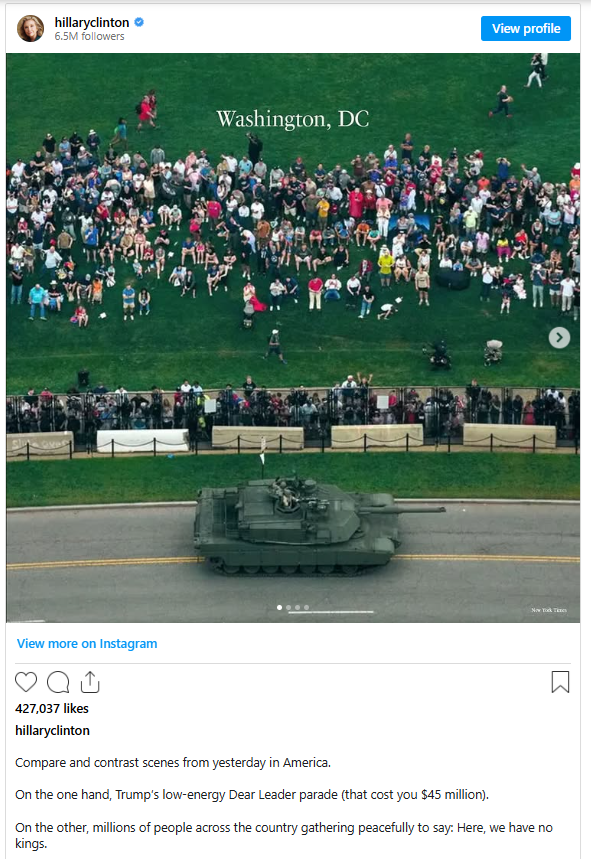 Hillary Clinton couldn’t resist commenting on the stark contrast. In a now-viral Instagram post, she shared side-by-side photos of Trump’s parade and the nationwide protests with a simple caption urging her followers to “compare and contrast scenes from yesterday in America.”